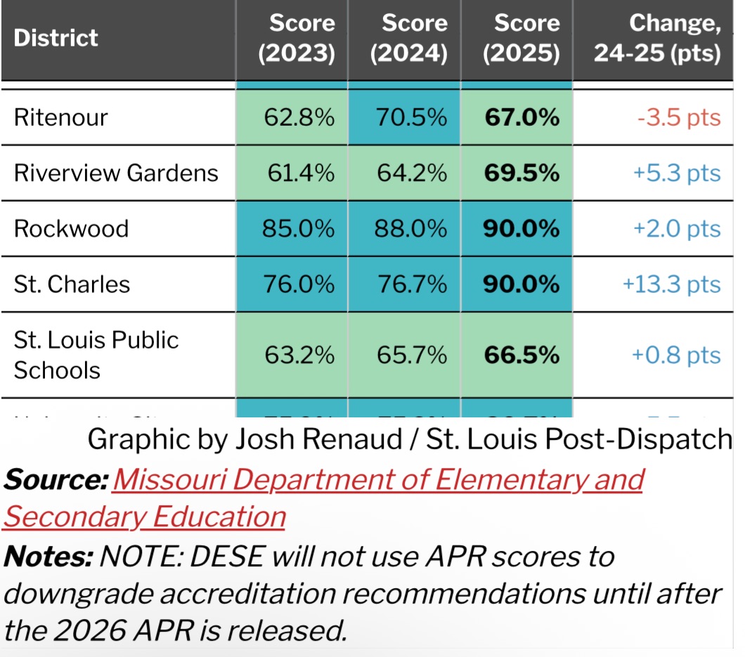 A Graphic by Josh Renaud of the St. Louis Post-Dispatch, uses data from the Missouri Department of Elementary and Secondary Education (DESE), documenting Saint Louis Public Schools' Annual Performance Report scores across three consecutive years. The data shows SLPS scoring 66.5 percent in 2025, up from 65.7 percent in 2024 and 63.2 percent in 2023. This data shows a consistent upward trajectory across every year of Dr. Borishade's tenure as Chief of Schools and Superintendent. The improvement reflects sustained academic progress in one of Missouri's most complex urban school districts.